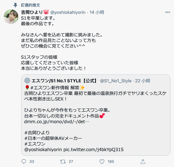 在S1出道的女优很难找不到工作,因为她们是全AV界条件最好的一群,所以除非吉冈ひより(吉冈日和)不想玩了,要不然她一定会有片子可演ー不过话说回来,作品发表后吉冈也跟著发表了毕业感言,但她除了感谢S1的工作伙伴以及支持自己的粉丝倒是没说未来想要干嘛⋯